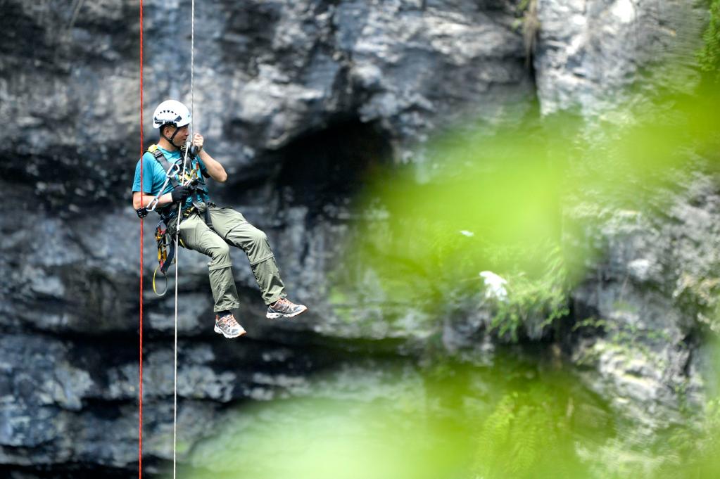 这是湖北省恩施土家族苗族自治州宣恩县的锣圈岩天坑,游客正在体验天坑索降。新华社发