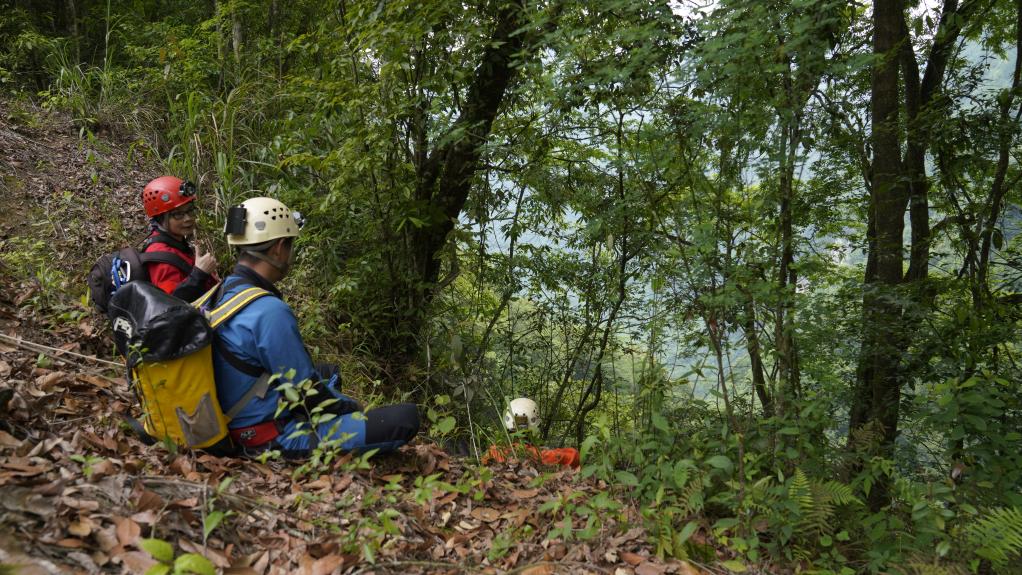 探险队员们在天坑底部进行科学探测