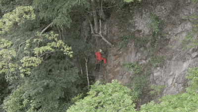 探险队员们沿着悬崖峭壁垂降