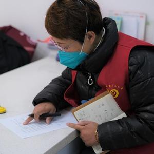 5月13日,张梅在西宁市城西区海晏路社区综合服务中心核对志愿者信息。(新华社记者 童昊 摄)