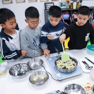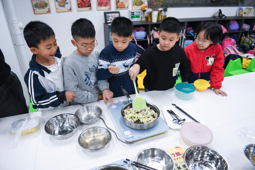 2021年11月9日,在广东佛山顺德的西山小学“西山厨神培训中心”,一、二年级学生学习如何烹饪肉丝炒花菜。新华社记者 毛思倩 摄