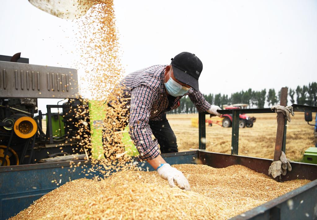 5月22日,河南省南阳市唐河县湖阳镇周安村村民在收获小麦。(新华社记者张浩然 摄)
