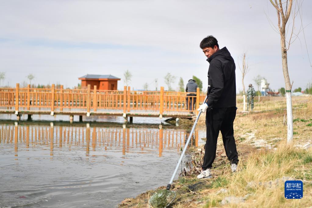 村民在甘肃省张掖市临泽县鸭暖镇白寨村的湖边清理环境(4月14日摄)。新华社记者 陈斌 摄