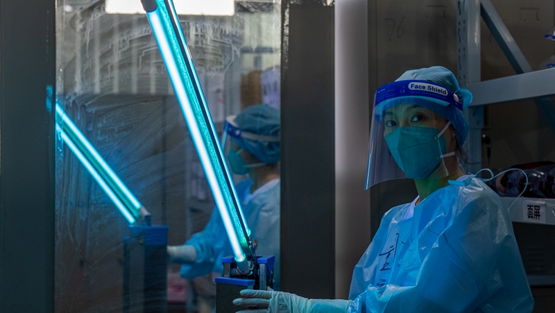 医疗队员周淼在方舱医院穿衣间进行紫外线消杀。 通讯员 李太杰 摄