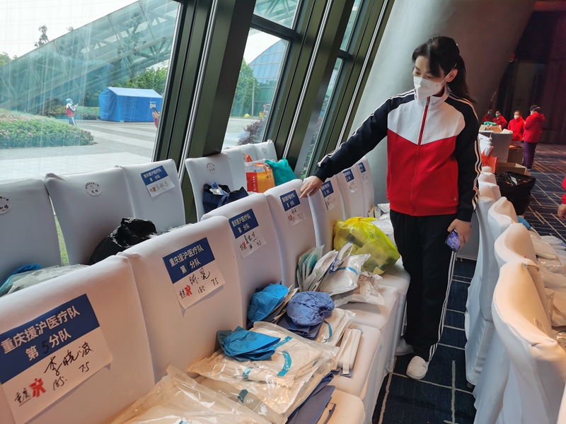 4月15日,重庆医疗队抵达上海次日,就接到进驻松江区2号方舱医院的任务。出发前,全体医疗队员都接受了院感防控培训和考核,随即表示“来之能战”。