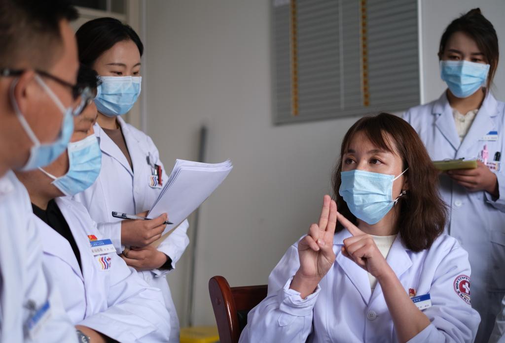 青海省人民医院医生、青南支医队员谢延玲(右二)和玉树藏族自治州人民医院医生探讨患者病情。(新华社记者央秀达珍 摄)