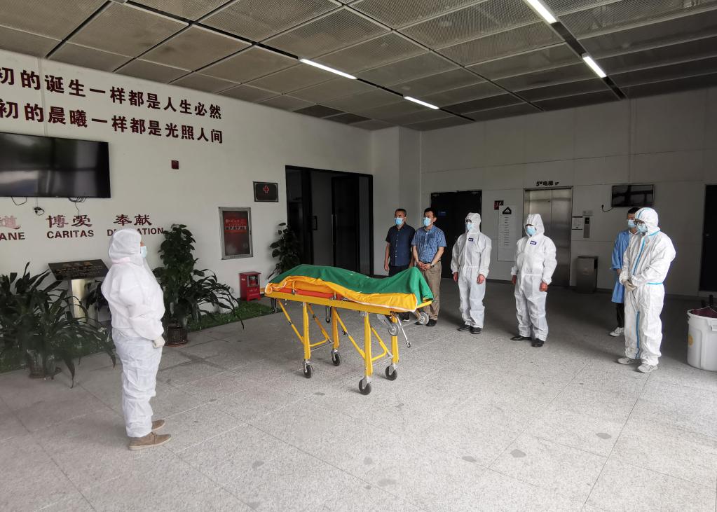 路途遥远,救护车上没有冷柜,要尽早启程。大雨中,前来送行亲友挥泪送别车辆远去。