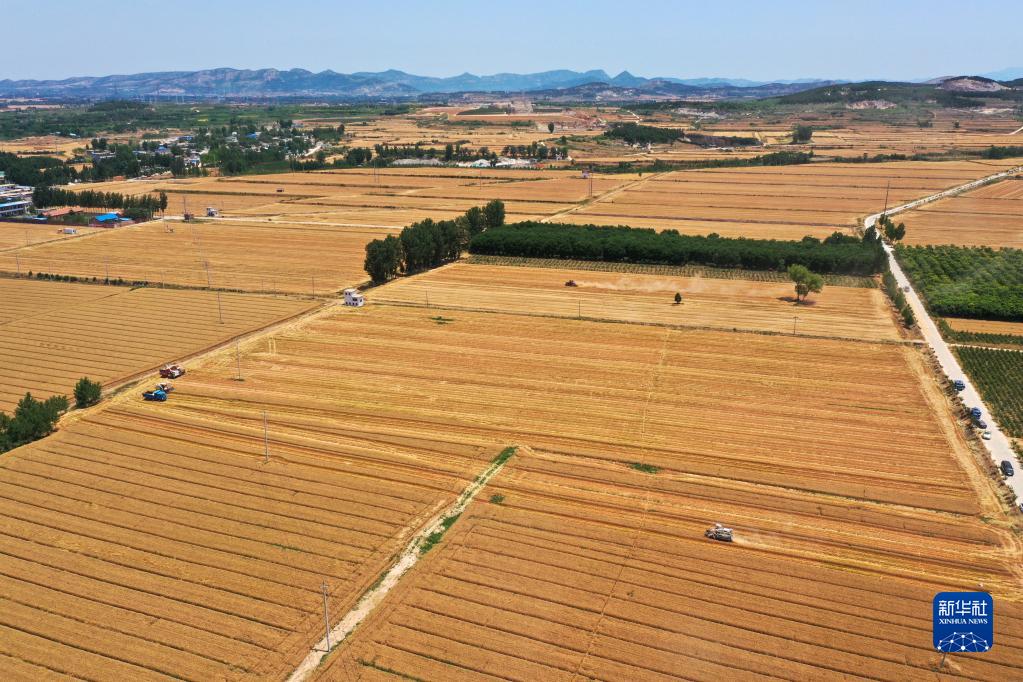 近日,黄河山东段两岸种植的小麦大面积成熟,农民抓住天气晴好的有利时机抢收小麦,确保颗粒归仓。