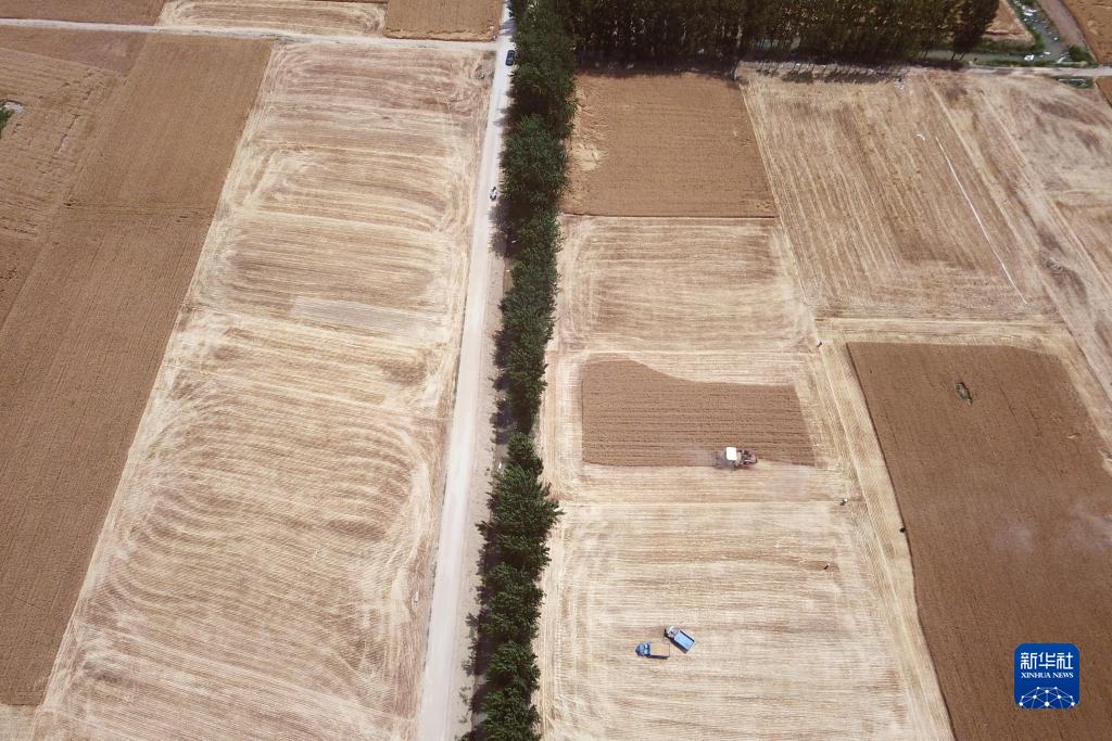6月7日,在山东省菏泽市东明县的黄河沿岸麦田,联合收割机在收割小麦(无人机照片)。