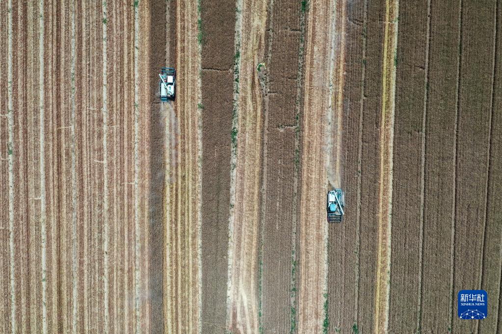 6月7日,收割机械在山东省济南市长清区归德街道翟庄村收割小麦(无人机照片)。