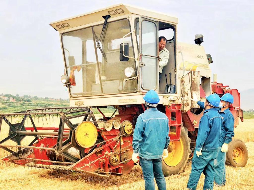 国家电网西安供电公司长安分公司工作人员在麦田叮嘱收割机手注意夏收安全。(受访者供图)