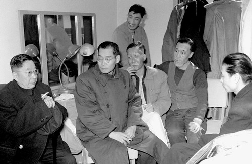 1958年3月,老舍(左一)看完《茶馆》彩排之后与导演焦菊隐(左二)、夏淳(右一)和演员于是之(右三)等座谈。(资料照片)