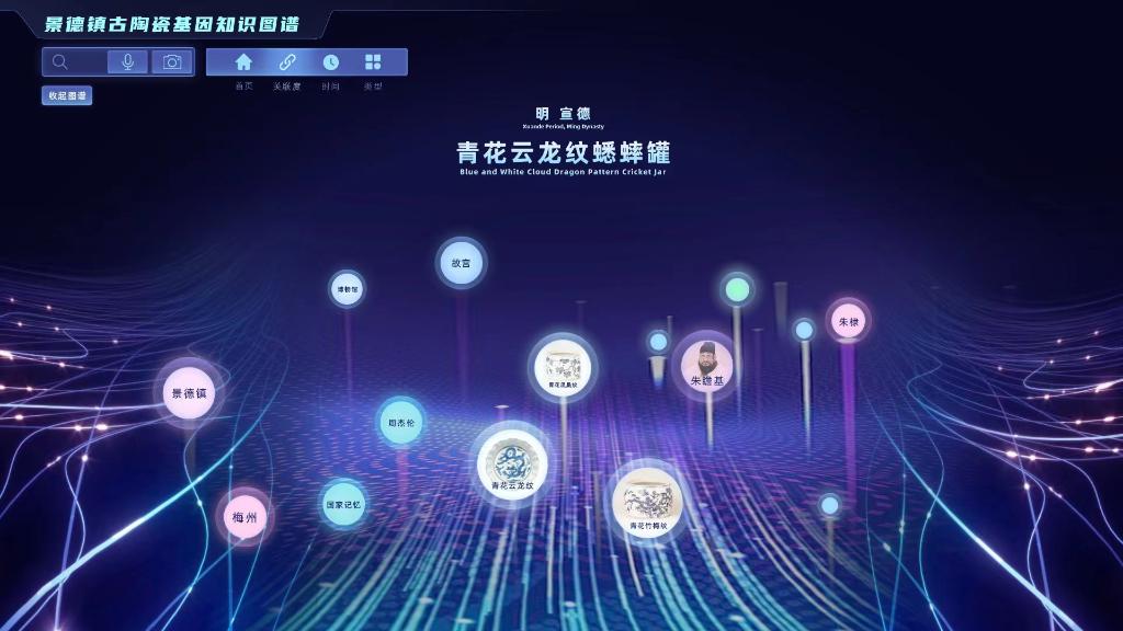 结合数字化等新技术,还可还原历史生活场景,勾连当下人文风物。同步绘制的景德镇古陶瓷基因知识图谱,把碎片化的信息整合成全景式的系统化知识。如一件明永乐时期的青花阿拉伯纹无挡尊,既可还原明代郑和下西洋时期东西方文化在器型和纹饰方面的交融,又可关联同款传世品的馆藏地故宫博物院、北京冬奥会青花瓷服饰等信息。