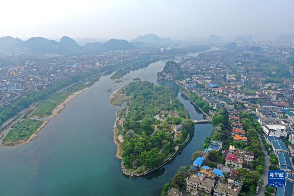 生态修复改造后的漓江伏龙洲景色(4月10日摄,无人机照片)。新华社记者 周华 摄