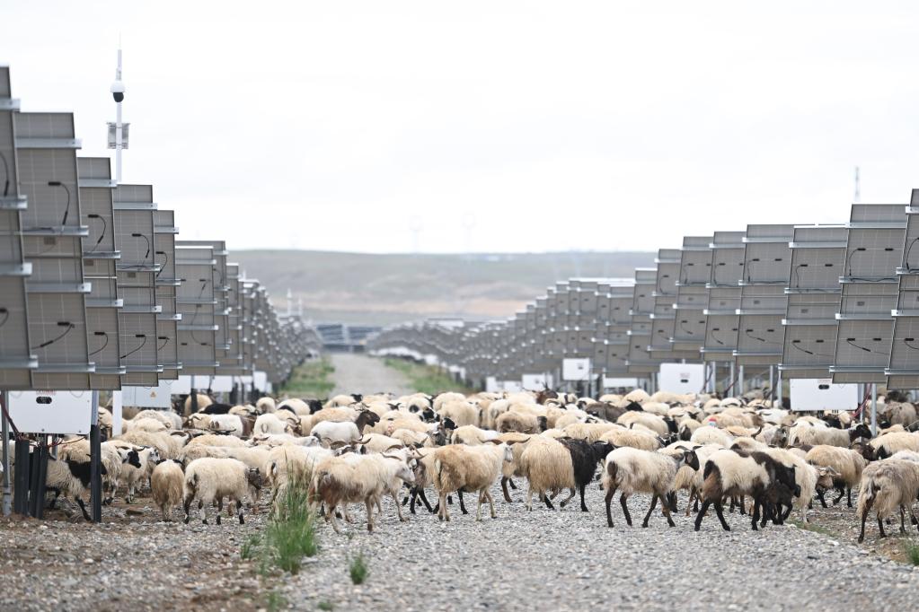 6月9日,一群羊在塔拉滩华能青海公司光伏电站内活动。新华社记者 骆晓飞 摄