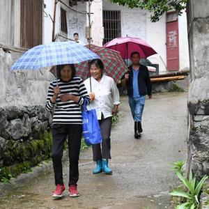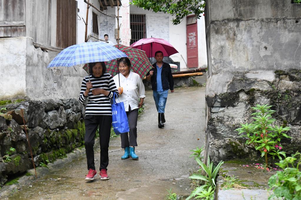 19日下午,天空淅淅沥沥下着小雨,在安徽省黄山市徽州区呈坎镇容溪村,村民胡爱萍和邻居一起冒雨走出家门,坐上镇政府安排的汽车,前往杨干集中安置区。