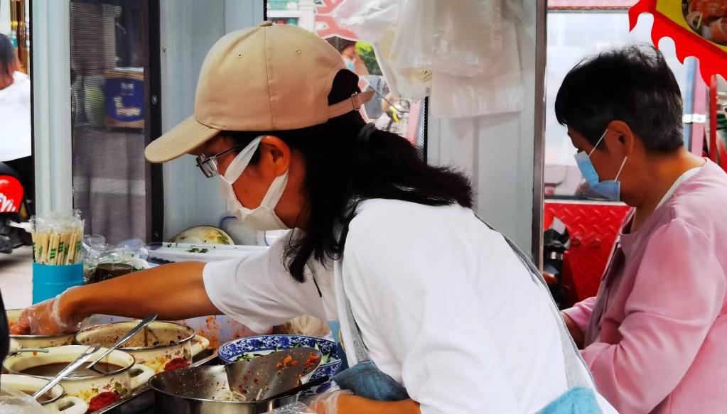 七十多岁的婆婆和朱艳并排站在摊边,婆婆麻利接过儿媳拌好的凉皮,一份份打包好,递到客人手中。
