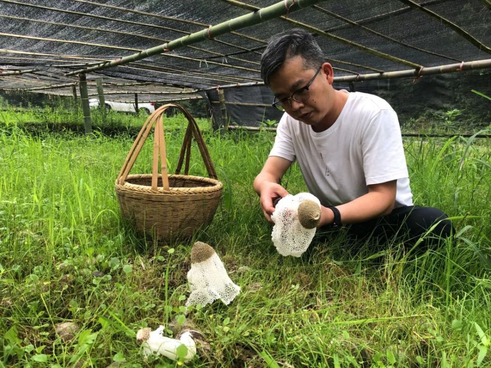 在萍乡市湘东区龙台村的乡村振兴产业实验基地,工作人员在收获竹荪。