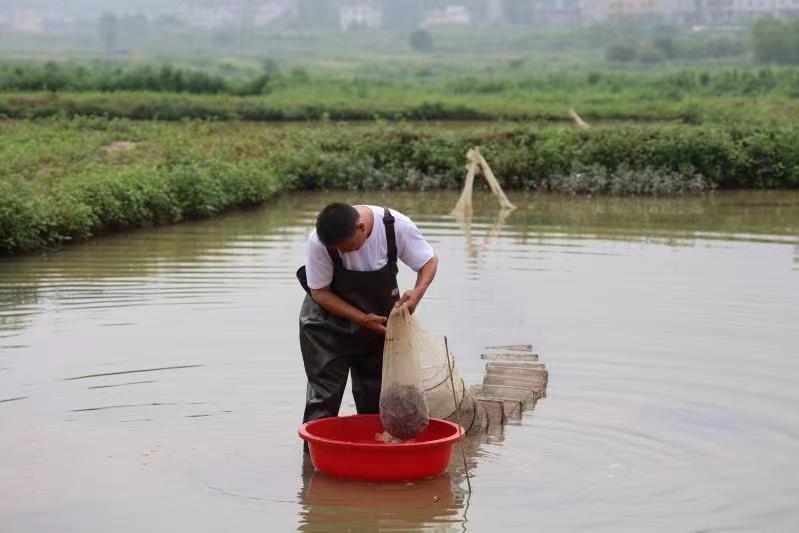 在湘东区横岗村稻田特色种养帮扶基地,养殖户正对小龙虾进行收笼、分拣,装筐,忙碌而又热闹。