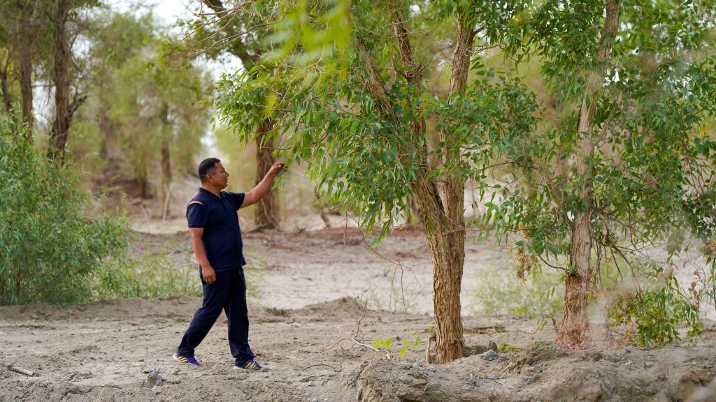 6月20日,艾力·尼亚孜在塔里木河支流查看胡杨生长情况。