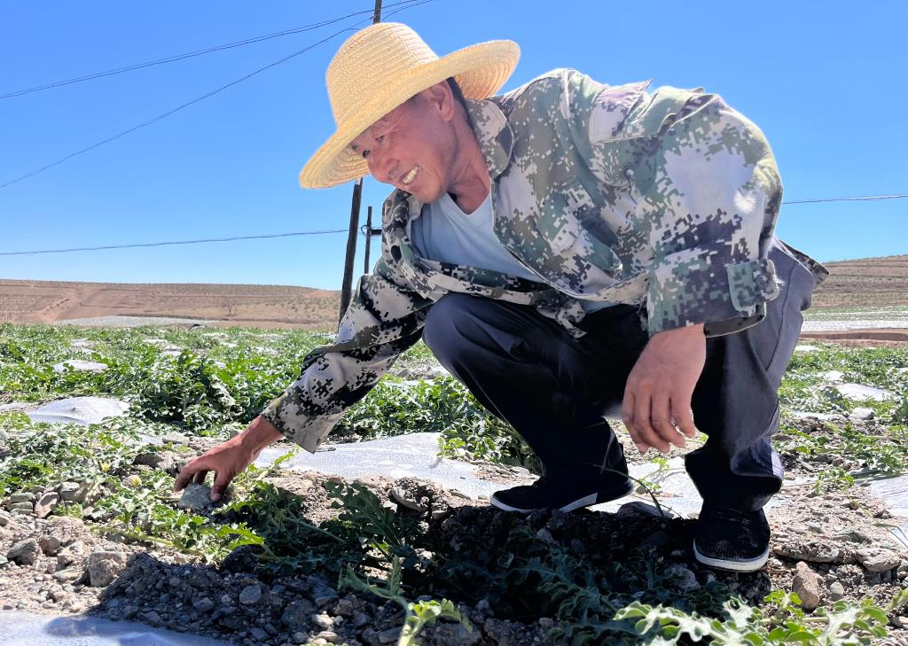 6月23日,甘肃省白银市靖远县靖安乡开龙村村民韦性武在瓜田查看硒砂瓜生长情况。新华社记者张玉洁 摄