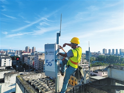 赣州移动公司深耕品质网络,加快5G基站建设,筑牢新型基础设施底座,提亮“数字中国”底色。图为移动通信人在维护5G基站。