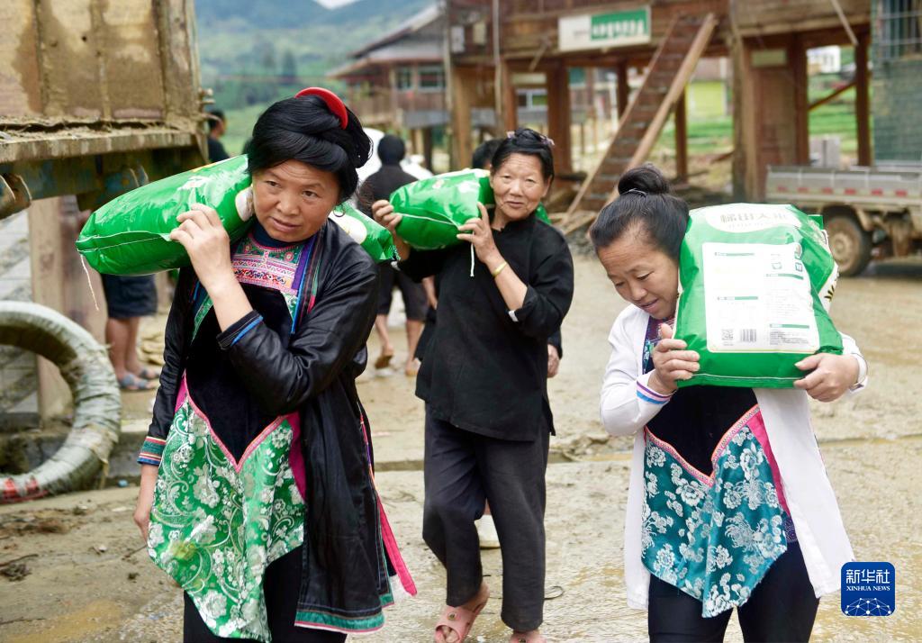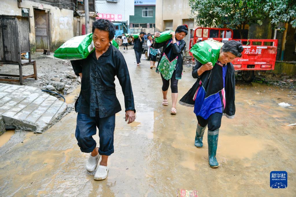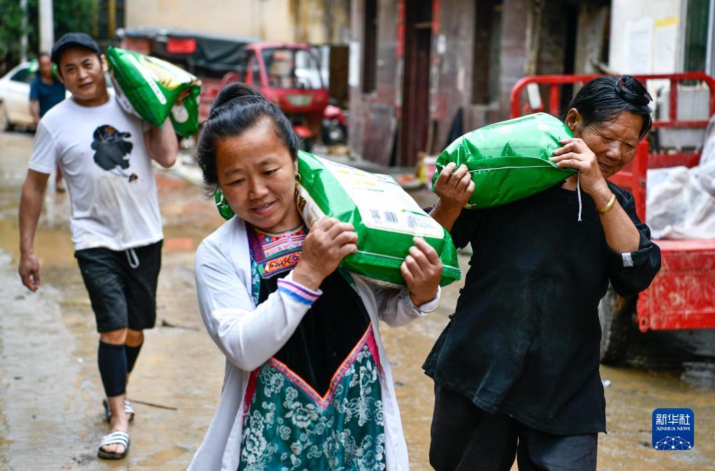 6月29日,在从江县丙妹镇龙江村,受灾村民在搬运救灾物品。新华社发(吴德军摄)