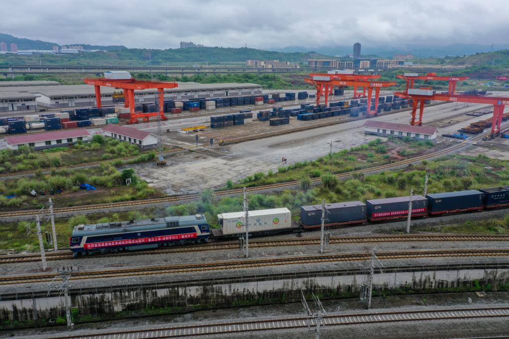 2022年5月19日,首列成渝地区双城经济圈货运班列顺利发车(无人机照片)。新华社记者 唐奕 摄