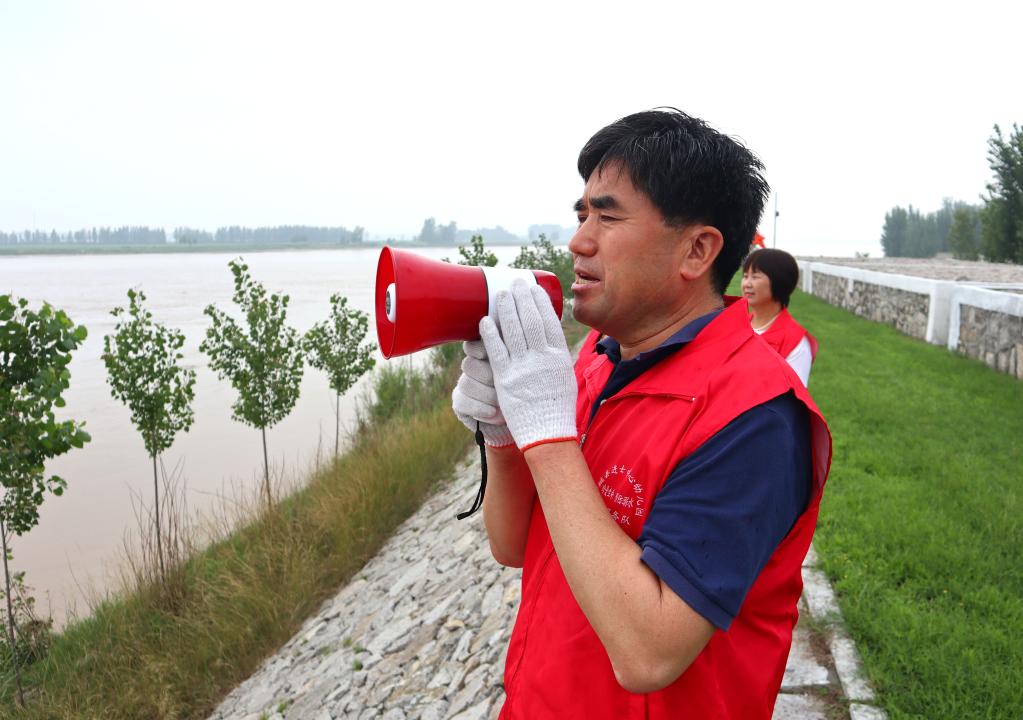 鄄城县阻泳志愿者林演华在黄河大堤上进行防溺水义务巡逻。新华社记者徐速绘摄