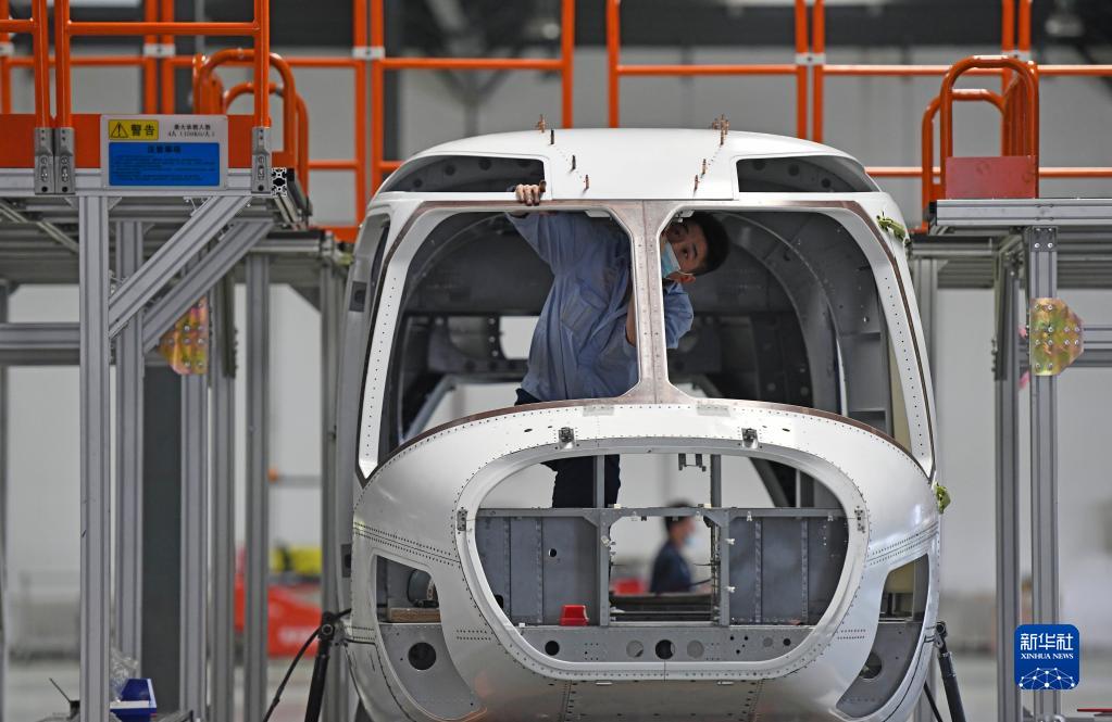 在中国航空工业集团天津直升机有限责任公司车间内,工作人员在进行AC332民用直升机的铆接作业(2022年5月19日摄)。新华社记者 赵子硕 摄