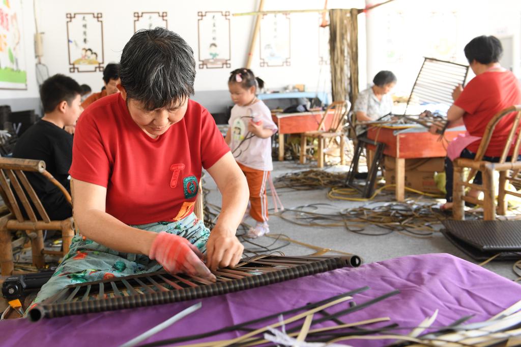 走进临海市河头镇前山二村党群服务中心,敞亮的大楼一层开着吊扇,不少村民系着围裙坐在竹椅上,熟练地编织休闲椅。旁边院内整齐停放着电动车,方便村民在家与工坊之间快速来回。