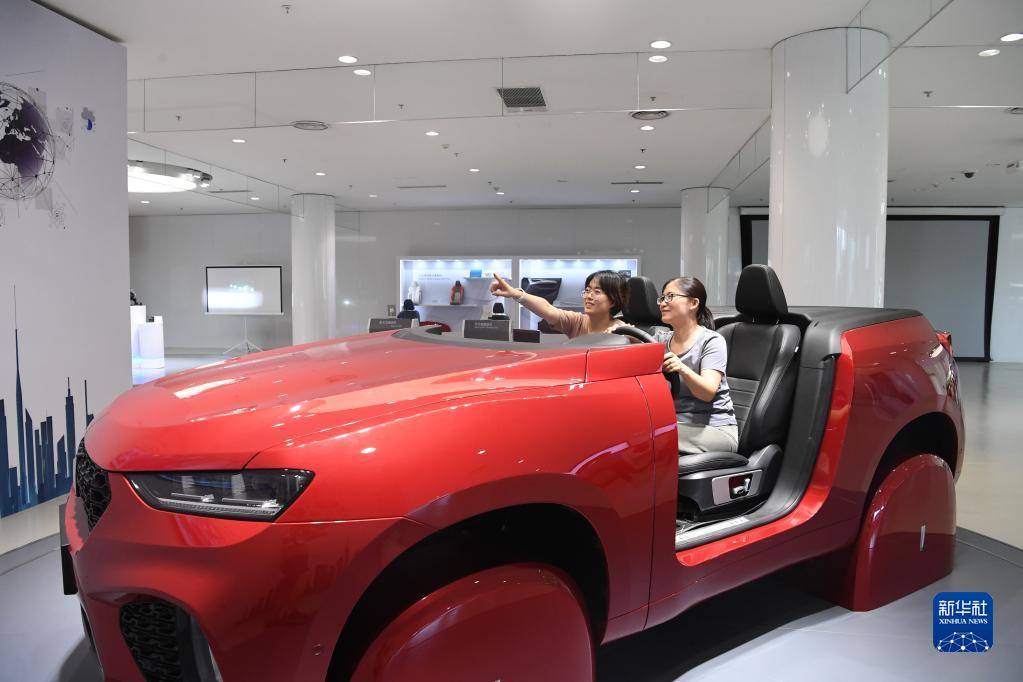 在河北保定市长城汽车哈弗技术中心,参观者在体验5G智能驾驶(2021年7月15日摄)。新华社记者 朱旭东 摄