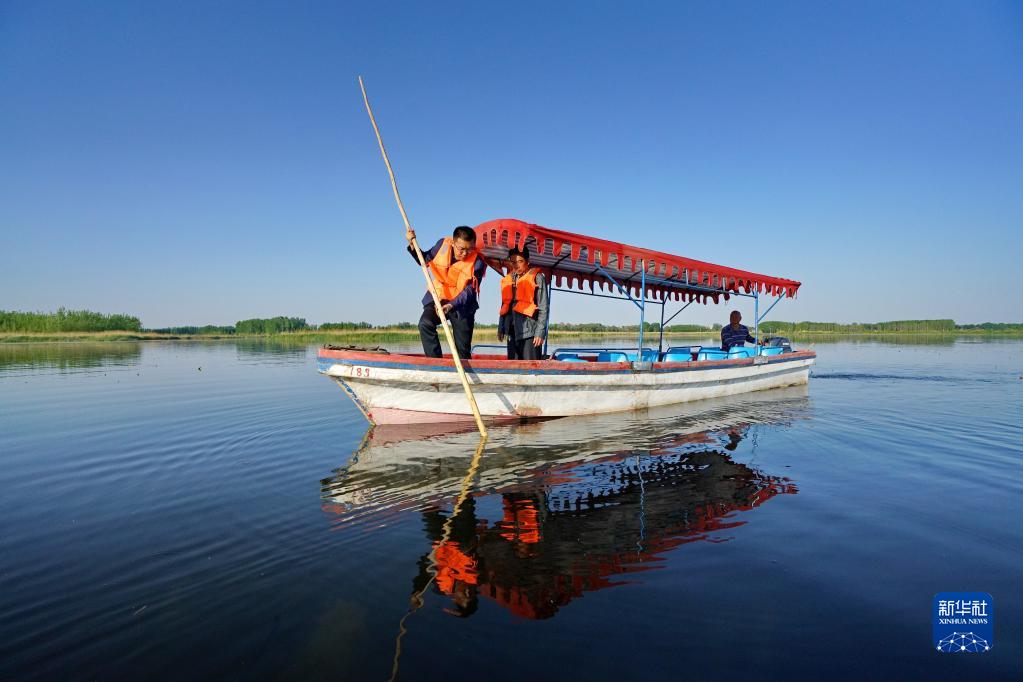 工作人员在白洋淀测量水位(2019年4月30日摄)。新华社记者 牟宇 摄