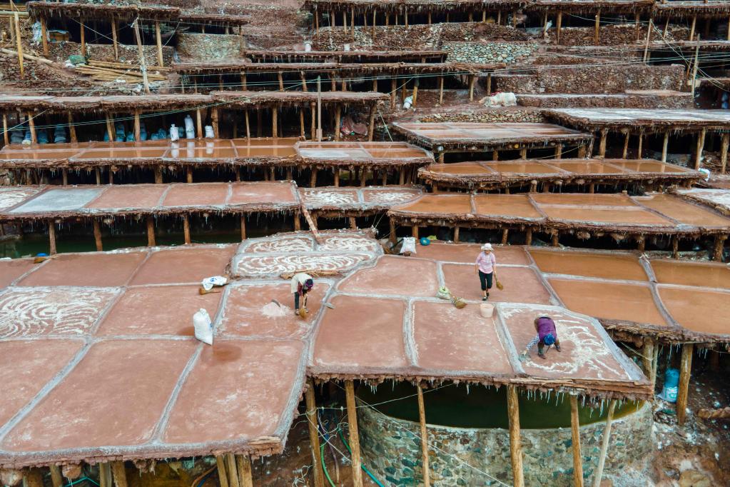 “3月到6月是晒盐的黄金时间,等到雨季来临,就不好晒盐了。”一大早,53岁的加达村村民美拉就来到盐田,开始了一天的劳作:从澜沧江畔的盐井抽取卤水到盐田,待风吹日晒后析出盐晶,再从盐田里刮出盐粒……