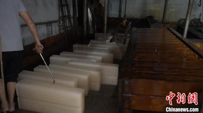 制冰厂工人在运装刚做出的冰块 张践 摄