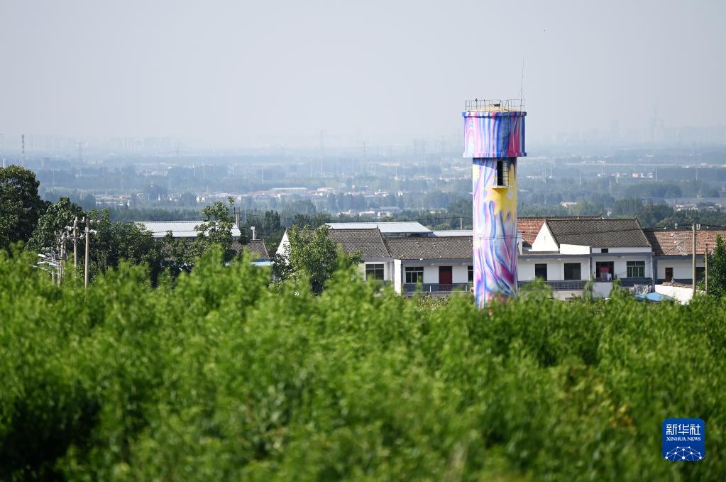 在西安市鄠邑区蔡家坡村,经过手绘美化后的水塔点缀在村庄中(7月5日摄)。