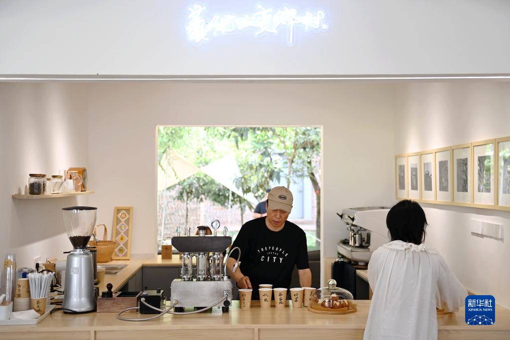 咖啡师沈洪义在蔡家坡艺术村长之家为顾客制作咖啡(7月5日摄)。