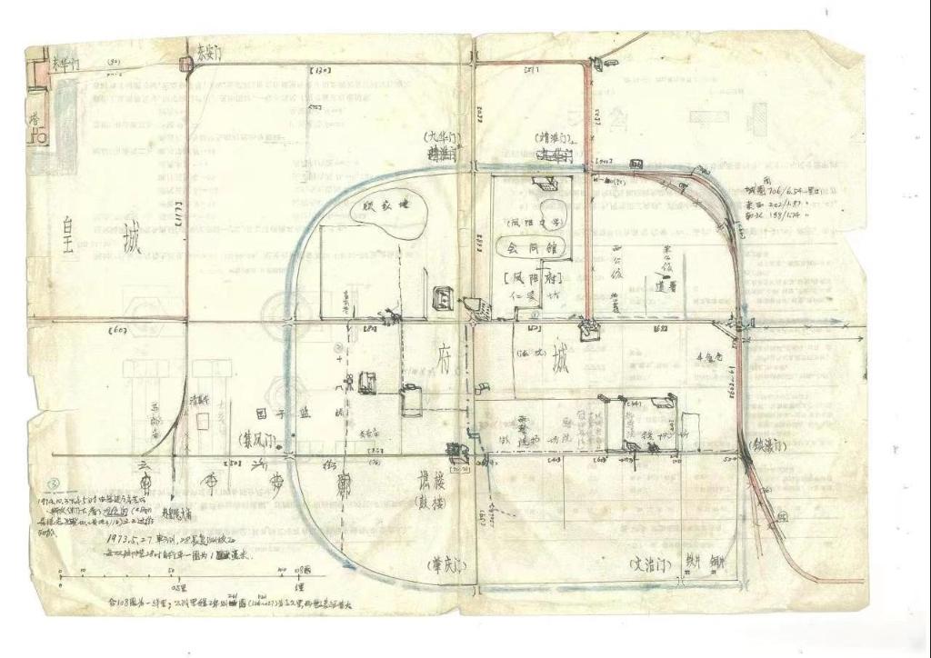 根据历代都城和宫殿建筑的规划思想、建筑格局、承袭规律,王剑英对明中都的每个部位、每件遗存逐一查勘测绘。王剑英有着极深的绘图功底,他手绘的遗址草图上,标识依然清晰可见,实线是已知的,虚线是断断续续的,点是大致推测的。标注上写着:1973年5月27日车测,28(日)晨复测校正,每双脚蹬28吋(英寸)自行车一圈,(在地图上是)1毫米。
