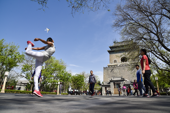居民在钟鼓楼广场踢毽子(东城区融媒体中心供图 新华网 发)