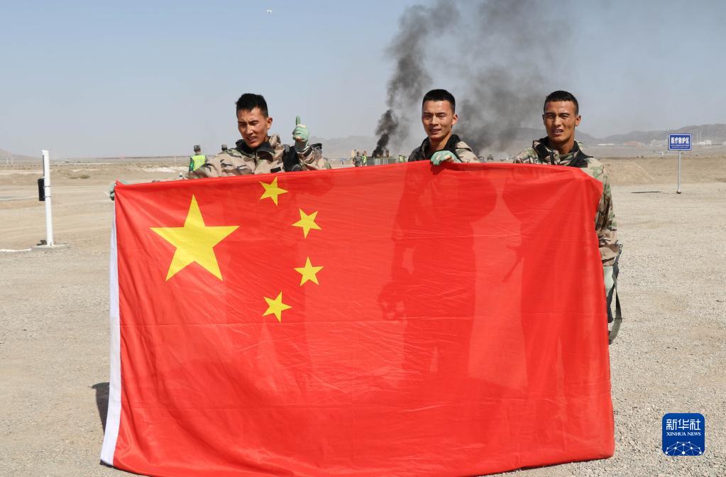 新疆军区某红军师“攻如猛虎英雄连”连长刘威(中)带队的中国参赛队在“国际军事比赛-2017”库尔勒赛区核生化侦察组比赛中夺得冠军(2017年8月2日摄)。新华社发(李康 摄)