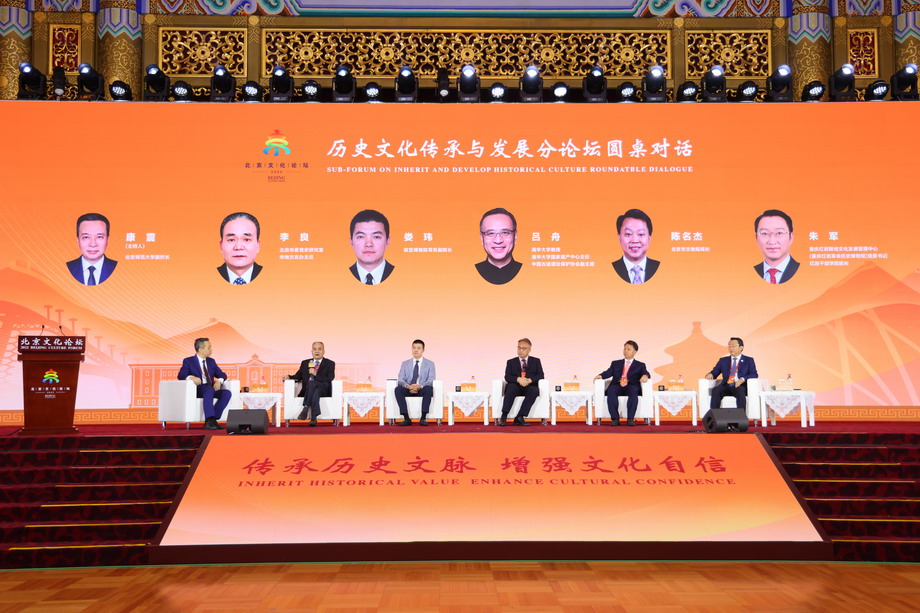 7月26日上午,北京文化论坛“历史文化传承与发展”分论坛在北京举行。分论坛以“传承历史文脉 增强文化自信”为主题,从弘扬中华优秀传统文化、红色基因传承赓续、博物馆之城建设、文物活化利用等不同角度进行深入交流研讨。图为分论坛圆桌对话环节。(歌华传媒集团供图)