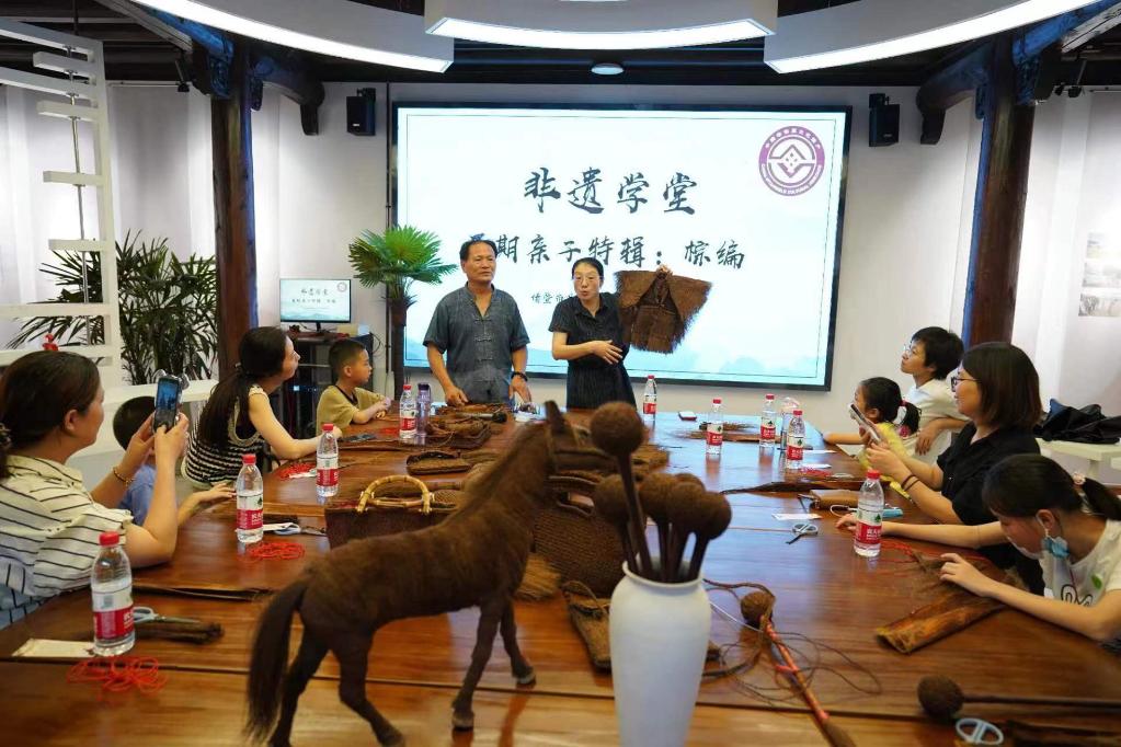 7月10日,浙江诸暨“非遗学堂”暑期亲子活动中,棕编工艺传承人寿洪正在授课。(图片由诸暨市委宣传部提供)
