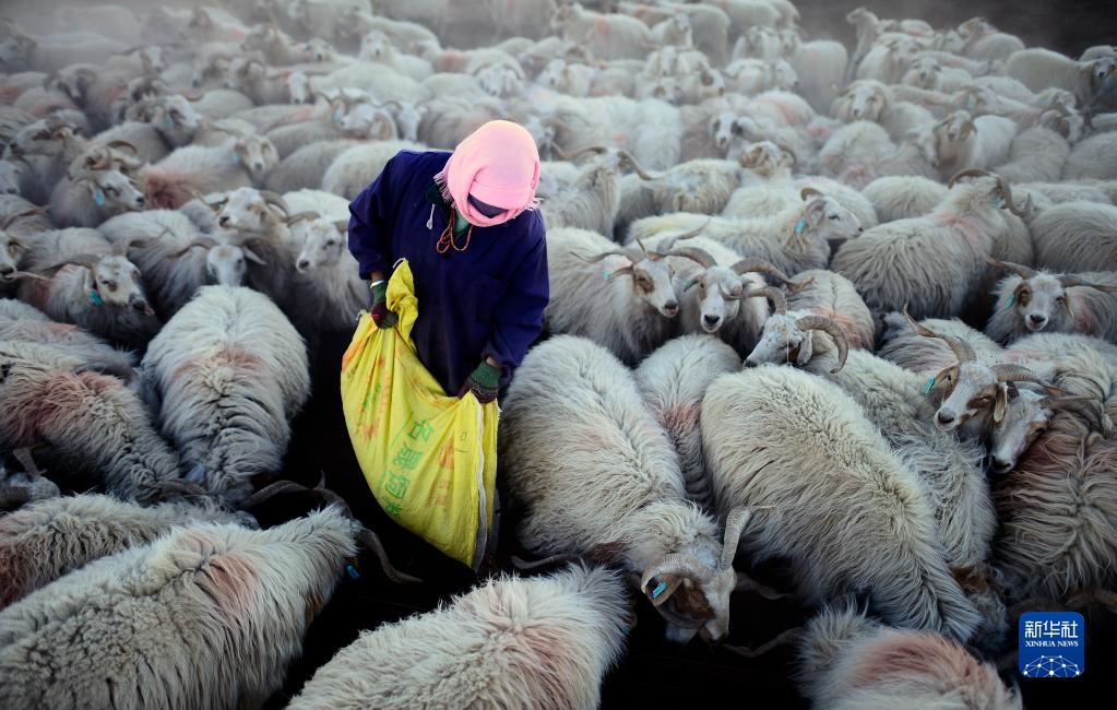 在青海省海北藏族自治州刚察县沙柳河镇新海村,牧民彭毛卓玛在给自家羊群喂饲料(2017年11月29日摄)。新华社记者 张宏祥 摄