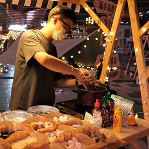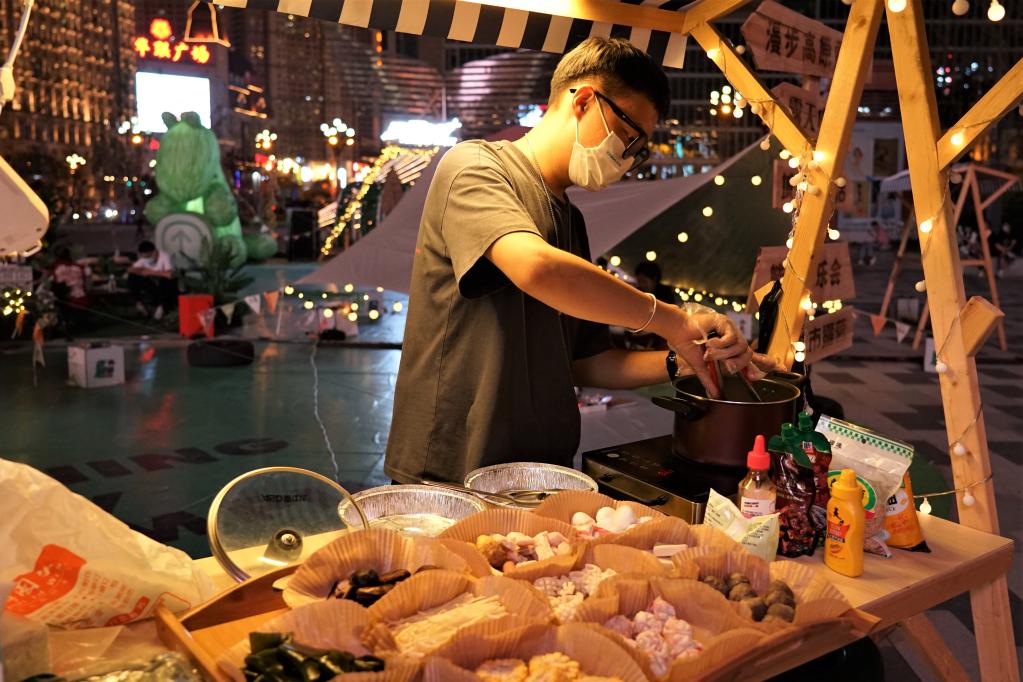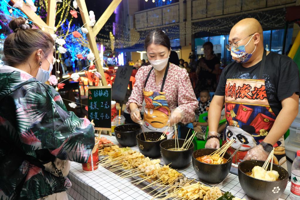 烤鱿鱼、关东煮、炸臭豆腐……热气腾腾的美食散发的香味,在夏日微风中弥漫在整个景区夜市。美食爱好者乔晓龙借助空余时间,连续多日在这里出摊。乔晓龙摊位上的手打柠檬茶和冰粉较受欢迎,出摊两小时就卖出去50多份。