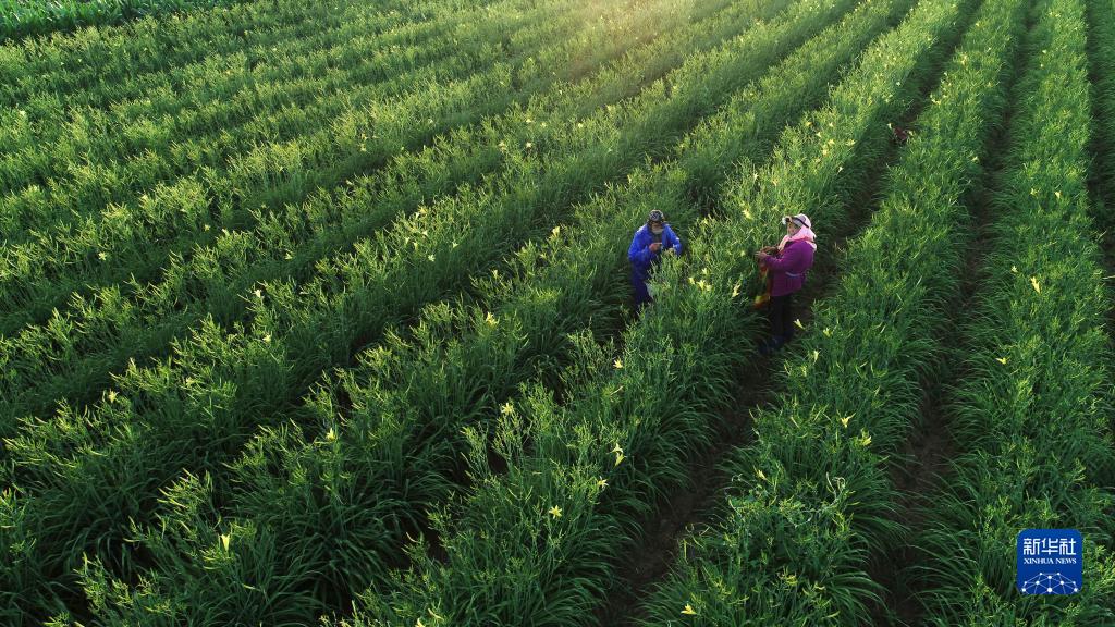 农户在宁夏吴忠市红寺堡区柳泉乡黄花菜基地采摘黄花菜(2022年7月5日摄,无人机照片)。新华社记者 王鹏 摄