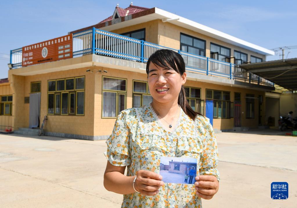 2022年8月4日,宁夏吴忠市红寺堡区新庄集乡白墩村村民王航弟在自家二层楼房前。她手里拿着的是10多年前住房的照片。新华社记者 冯开华 摄