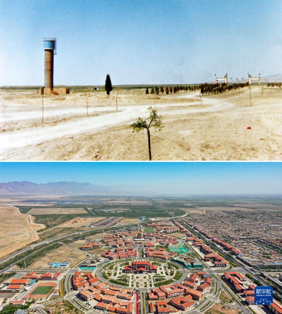 拼版照片:上图为建设初期的宁夏永宁县闽宁镇景象(资料照片);下图为2021年6月3日拍摄的宁夏永宁县闽宁镇(新华社记者冯开华摄,无人机照片)。新华社发
