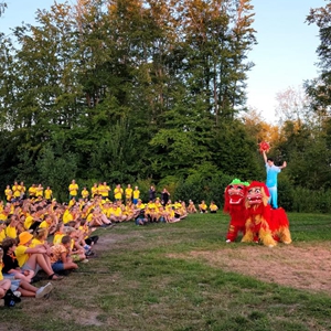 8月8日,在荷兰泽沃尔德市,参加夏令营的青少年在中国长城营地欣赏舞狮表演。新华社记者 王湘江 摄