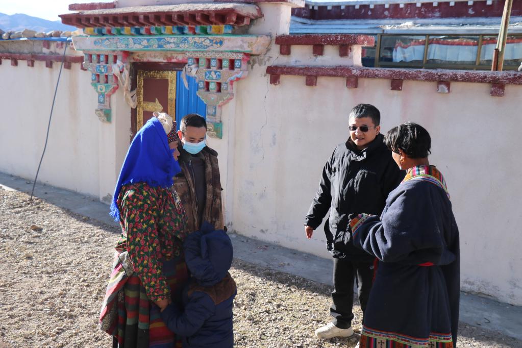 王军强(右二)在申扎县巴扎乡结对帮扶户达吉家中了解生活情况。(图片由申扎县委宣传部提供)