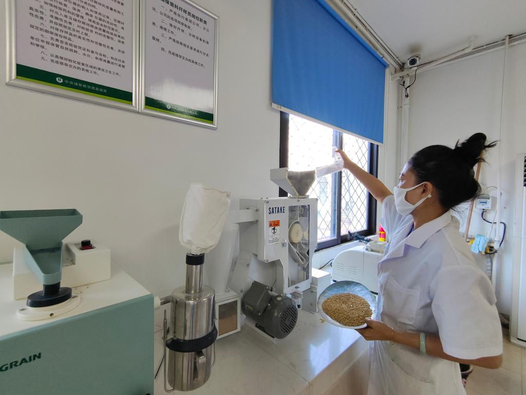 工作人员正在对入库稻谷进行质量抽检。新华社记者 周勉 摄